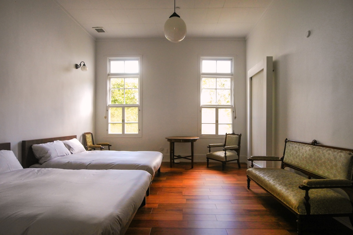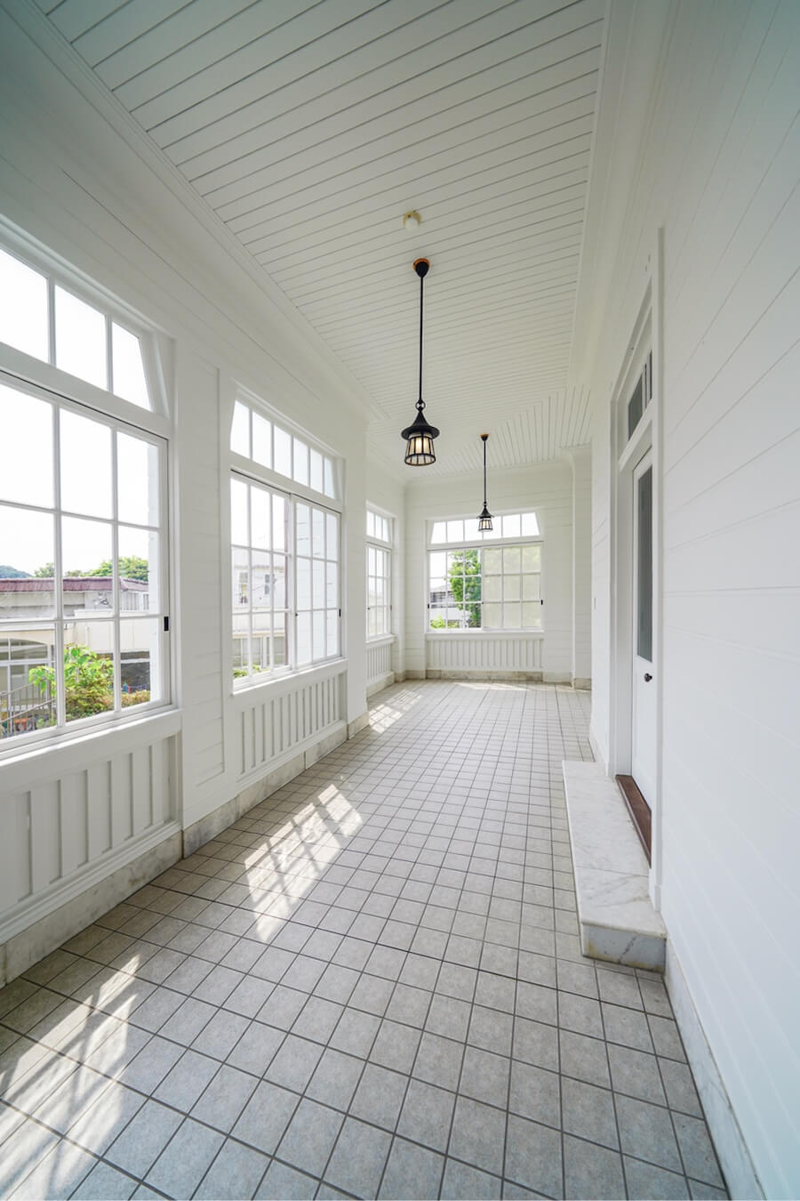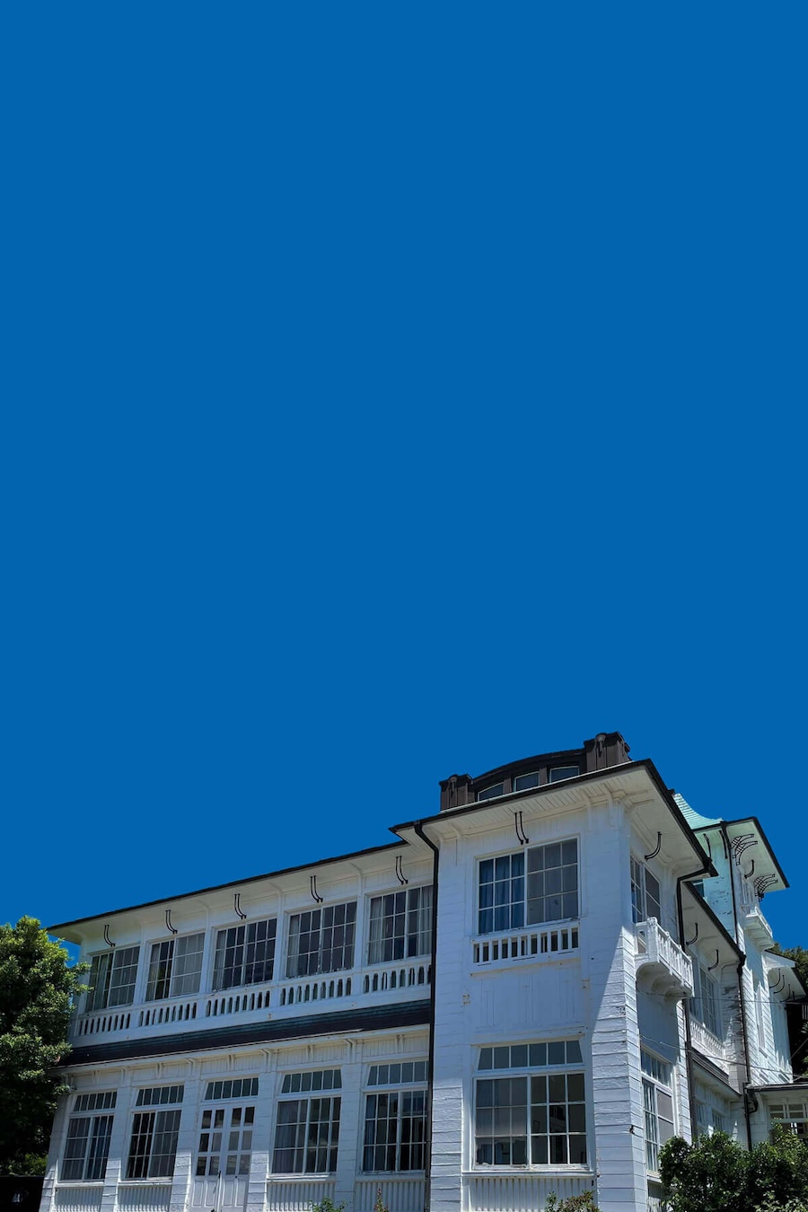 建物は木造2階建て、銅板葺き。酸化によって深みのある緑青を帯びた屋根と、白く端正なドイツ下見板張りの外壁が特徴です。大きな窓や海を望む廊下(サンルーム)など、威厳と優雅さを兼ね備えた意匠が随所に見られます。宿泊では2階を中心にお過ごしいただけます。